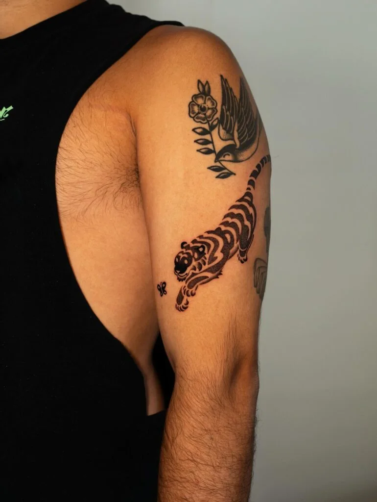 Placed on the inner bicep, this design becomes an intimate yet powerful statement, representing vigilance, wisdom, and inner strength. It’s an excellent choice for anyone who wants a minimalist yet impactful tiger tattoo.