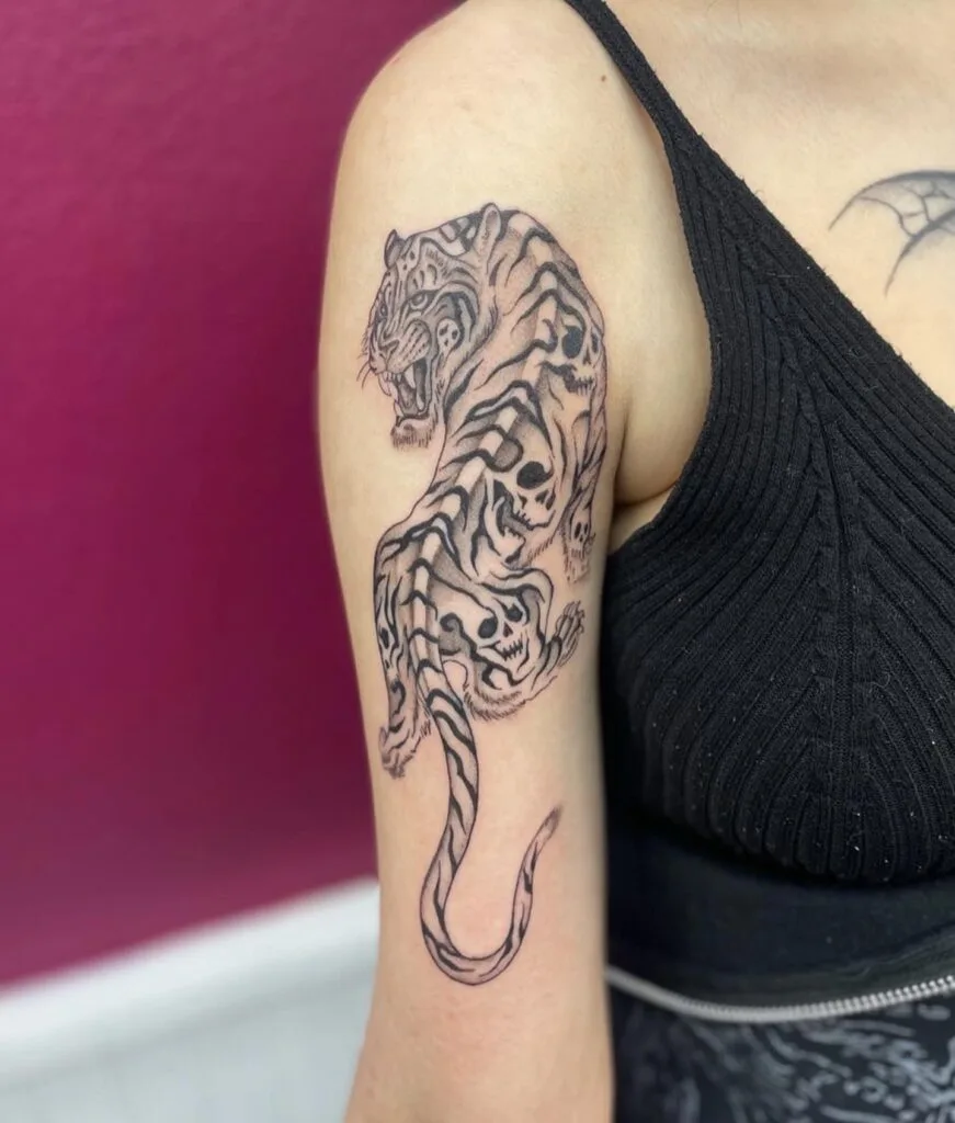 This bold tattoo captures a roaring tiger in mid-motion, its stripes cleverly integrated with skull motifs. The design symbolizes fearlessness, mortality, and raw energy, creating a piece that feels both primal and deeply symbolic.