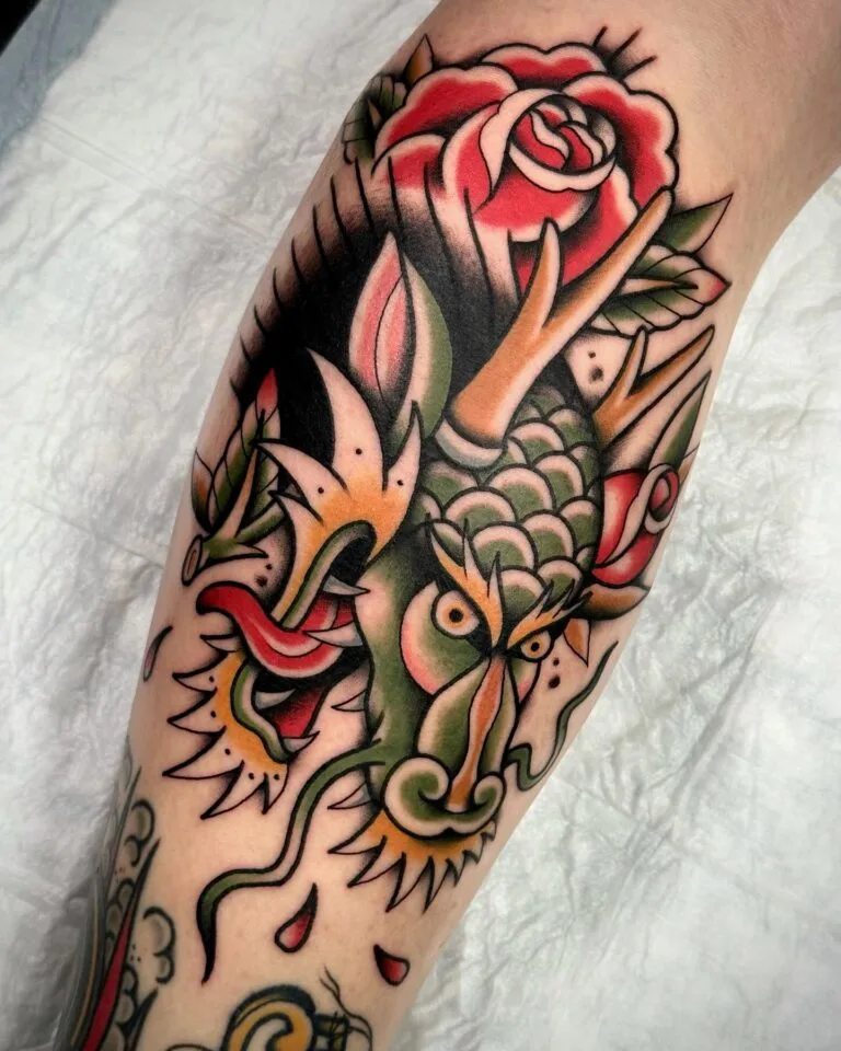 - Description: This tattoo features a fearsome green dragon intertwined with vibrant red roses. The dragon’s intricate scales and sharp features contrast beautifully with the softness of the roses. Combining mythical strength with romantic symbolism, the design captures themes of power, mystery, and passion.