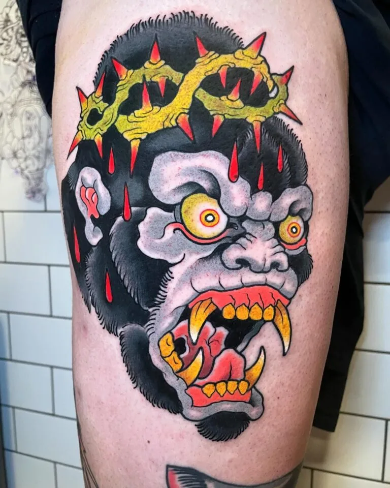 - Description: This tattoo showcases a gorilla with a fierce expression, adorned with a golden crown of thorns dripping with red blood. The contrast between the dark fur, bright yellows, and vivid reds creates a bold visual impact. The design blends elements of raw power and suffering, with symbolic undertones of struggle and redemption.