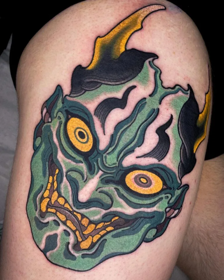 - Description: This vibrant tattoo features a traditional Japanese oni mask in green with sharp fangs, piercing yellow eyes, and orange-yellow horns. The mask’s bold lines and color palette evoke themes of protection against evil spirits, while the intricate shading adds a modern flair to the traditional imagery.