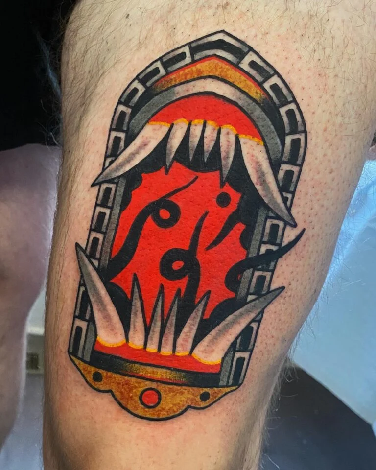 Description: This bold tattoo features a monstrous mouth with sharp teeth, opening to reveal a vivid red interior. The geometric frame and clean lines give it a structured yet menacing appearance. This design often symbolizes fearlessness and the ability to confront challenges head-on.