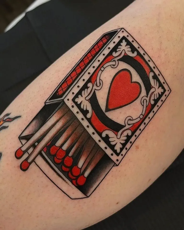 Description: A classic matchbox tattoo with intricate details, featuring a heart motif on the box. The bold red and black design emphasizes passion and heat, while the ornate patterns surrounding the heart add an elegant touch. This design symbolizes intensity, love, and sometimes fleeting emotions.