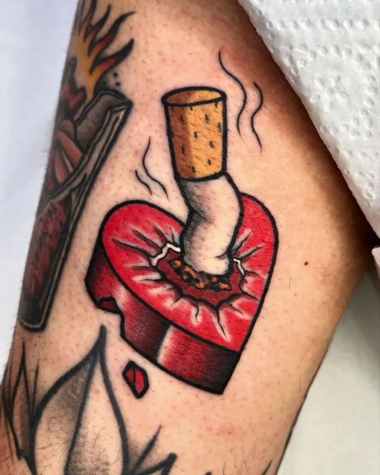 Description: This tattoo creatively depicts a cigarette stubbed out in a bright red, broken heart. The cracked heart and rising smoke symbolize loss, heartbreak, and emotional pain. The bold outlines and sharp details make it a powerful and raw statement piece.