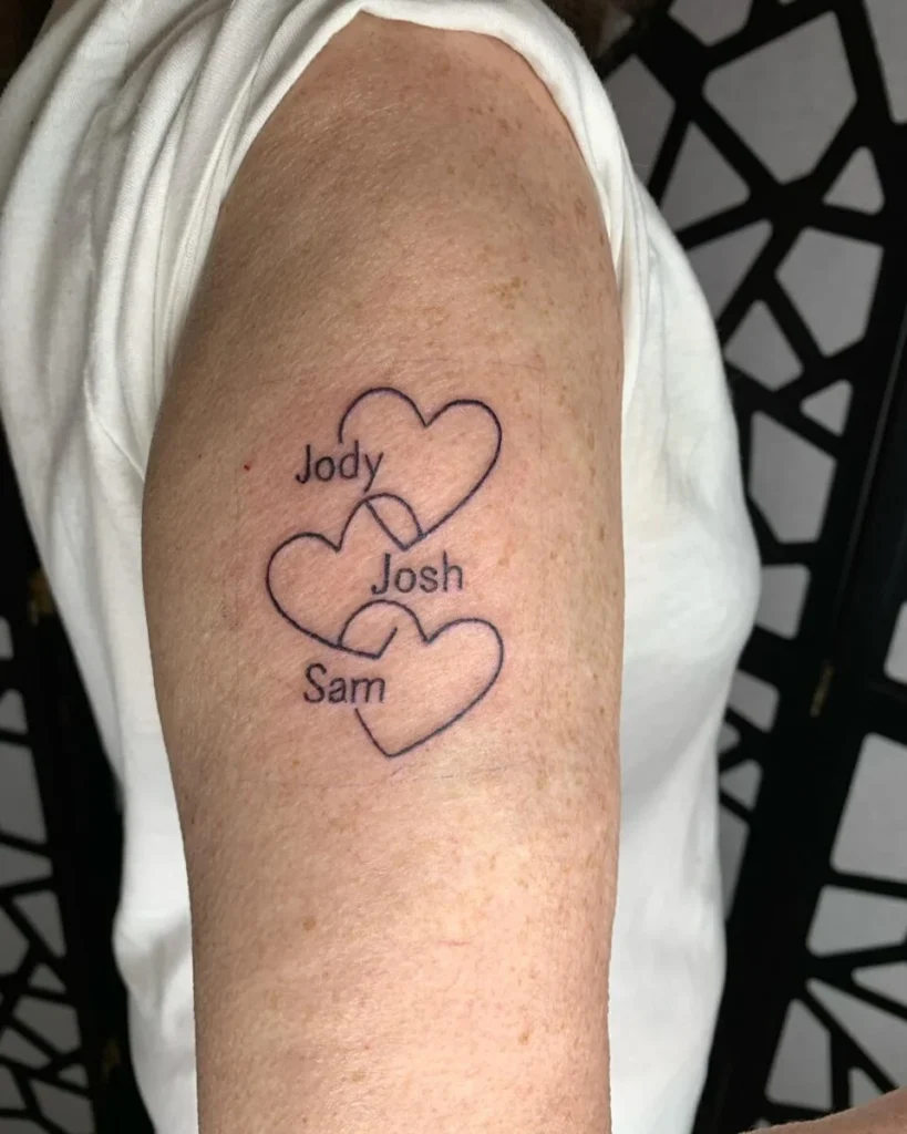 This tattoo features three delicately outlined hearts interlocked together, each containing a name: Jody, Josh, and Sam. It represents the unbreakable bond between loved ones, most often children or family members, who remain forever connected.