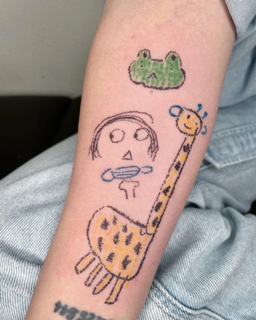 This tattoo reproduces a child’s drawing of a smiling giraffe, paired with simple doodles of a face and a green animal figure above. Crayon-like textures and uneven outlines make it look like artwork lifted directly from a child’s paper, immortalizing that fleeting creativity.