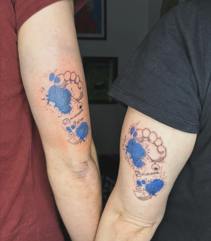 This design features matching tattoos on two arms, each showcasing a baby’s footprint in vibrant blue ink with watercolor splashes. Alongside are meaningful details like the child’s name, date of birth, weight, and height—personalizing it into a permanent keepsake.