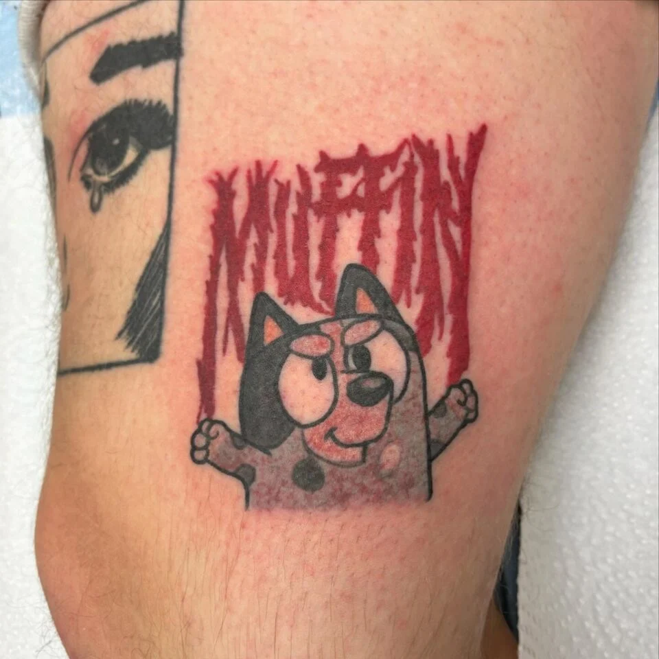 This colorful tattoo depicts Muffin from the beloved kids’ show Bluey, radiating joy and cheeky personality. The character’s wide grin and lively expression capture childhood’s boundless energy and silliness. The bold red “Muffin” text in a rough-edged font adds a dramatic contrast, giving the tattoo both fun and edge.