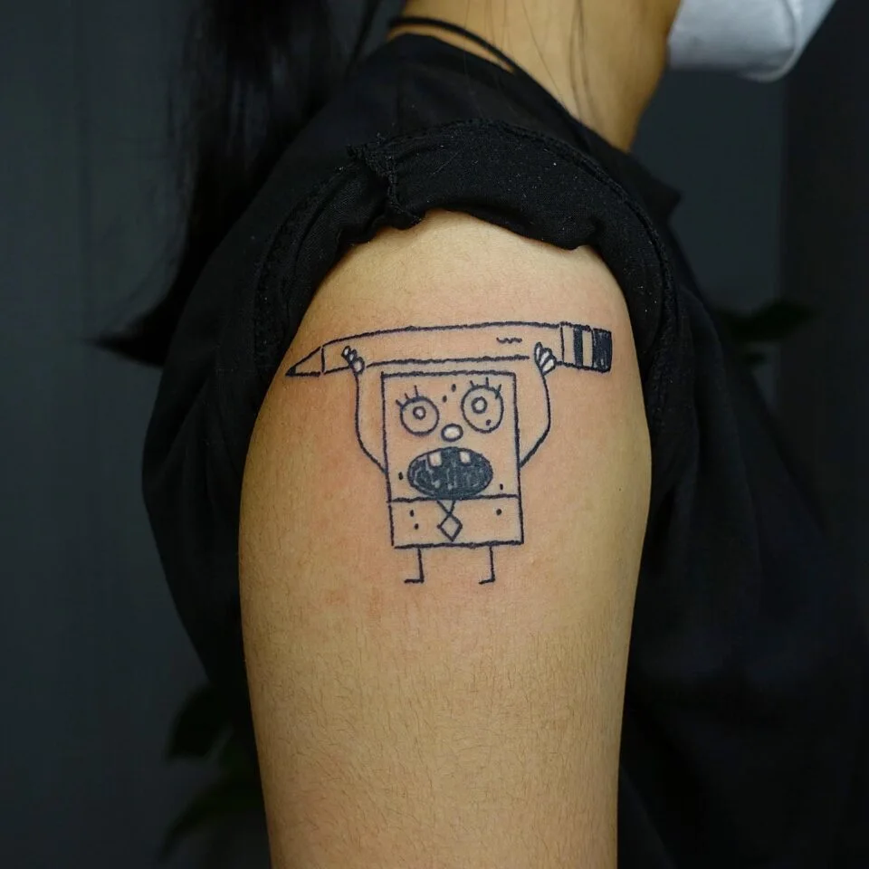 This tattoo looks as though a child sketched SpongeBob holding up a giant pencil, complete with playful imperfections. The uneven lines, large teeth, and bold expressions mirror the whimsical honesty of children’s artwork. It captures the fun, carefree spirit of both SpongeBob and the youthful creativity kids bring into everything they draw.