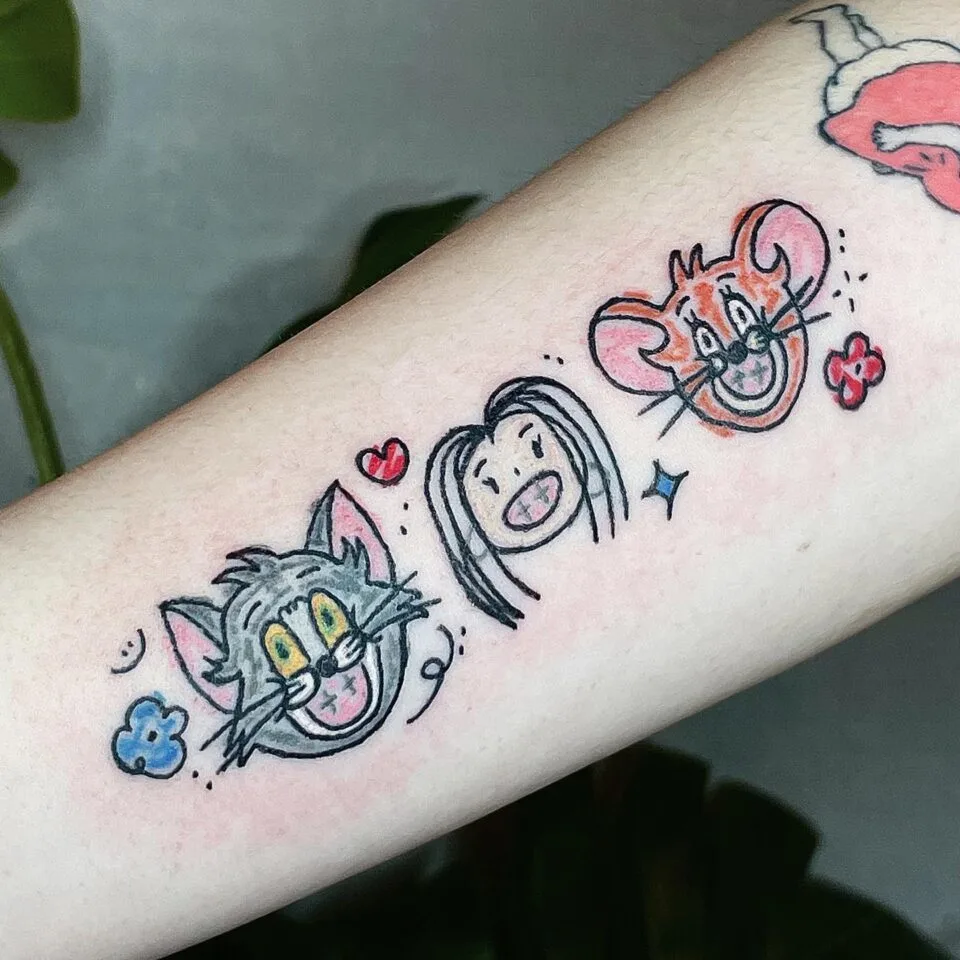 Here, we see a delightful tattoo that feels as if it leapt out of a child’s sketchbook. Featuring Tom and Jerry alongside a childlike self-portrait, the design captures the joy of childhood cartoons and imaginative storytelling.