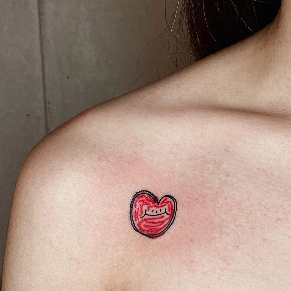 This tiny red heart tattoo looks as if it were drawn with crayons, its uneven coloring and simple smiley face adding to its authentic, childlike charm. It captures the innocence of a child’s attempt to draw love, making it an endearing keepsake for any parent or loved one.