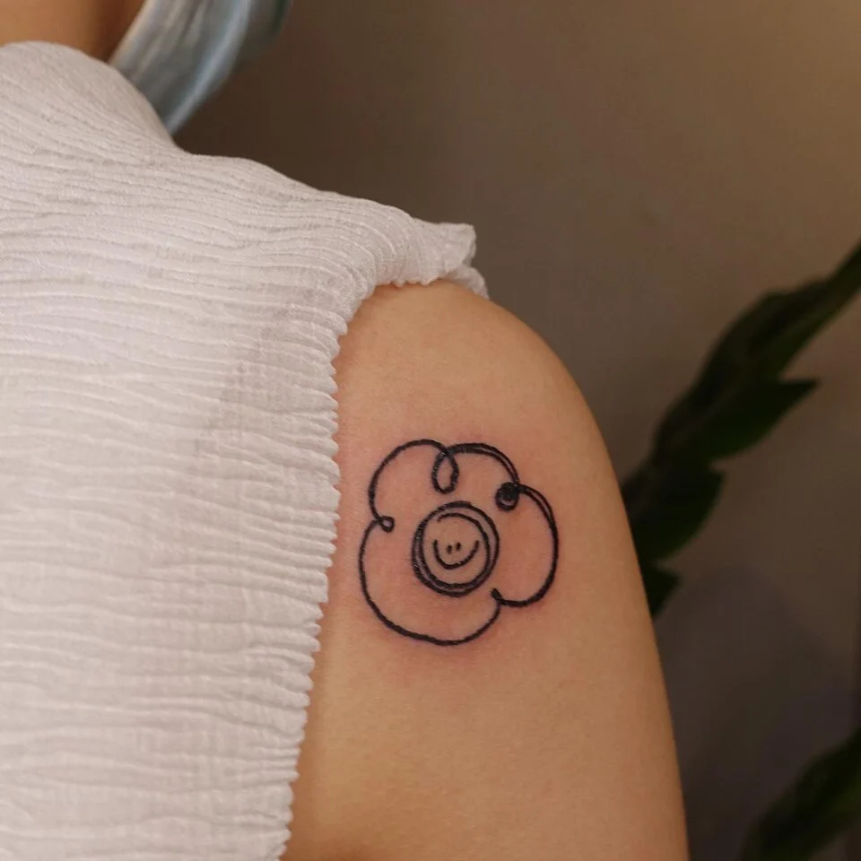 This tattoo features a flower with rounded petals encircling a smiley face at the center, evoking a playful, child-drawn style. Its simplicity is heartwarming, as though it came straight from a child’s drawing pad. The design radiates positivity and warmth, symbolizing growth, happiness, and the joy of nurturing bonds.
