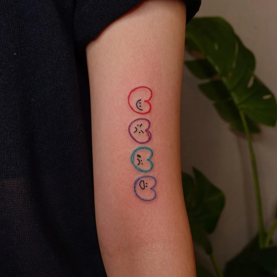 This tattoo showcases a series of hearts in red, purple, teal, and blue, each containing different facial expressions. The gradient of colors adds vibrancy, while the childlike faces bring a playful, whimsical energy. It looks like something drawn in a coloring book, making it deeply nostalgic and heartfelt.
