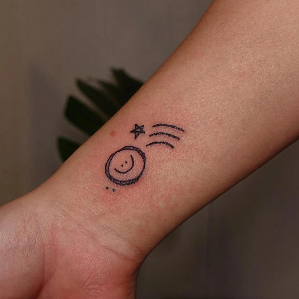 This tattoo depicts a playful circular smiley face paired with a star and whimsical motion lines, evoking the charm of a child’s doodle. It gives the impression of a shooting star traveling happily through space, spreading positivity along the way. Its simplicity makes it look spontaneous, much like a child’s innocent sketch.