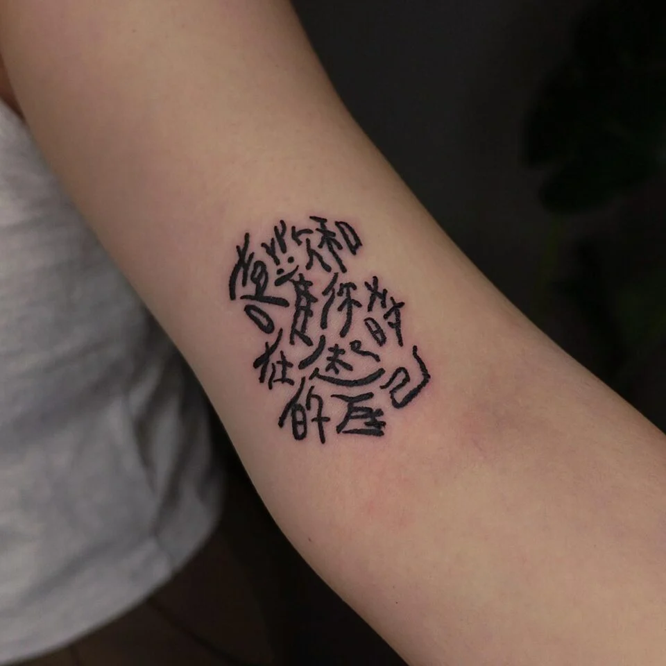 This tattoo showcases playful, childlike handwriting arranged in a free-flowing style that resembles a doodle straight from a notebook. Its charm lies in the irregular strokes and uneven shapes, capturing the authenticity of a child’s drawing.