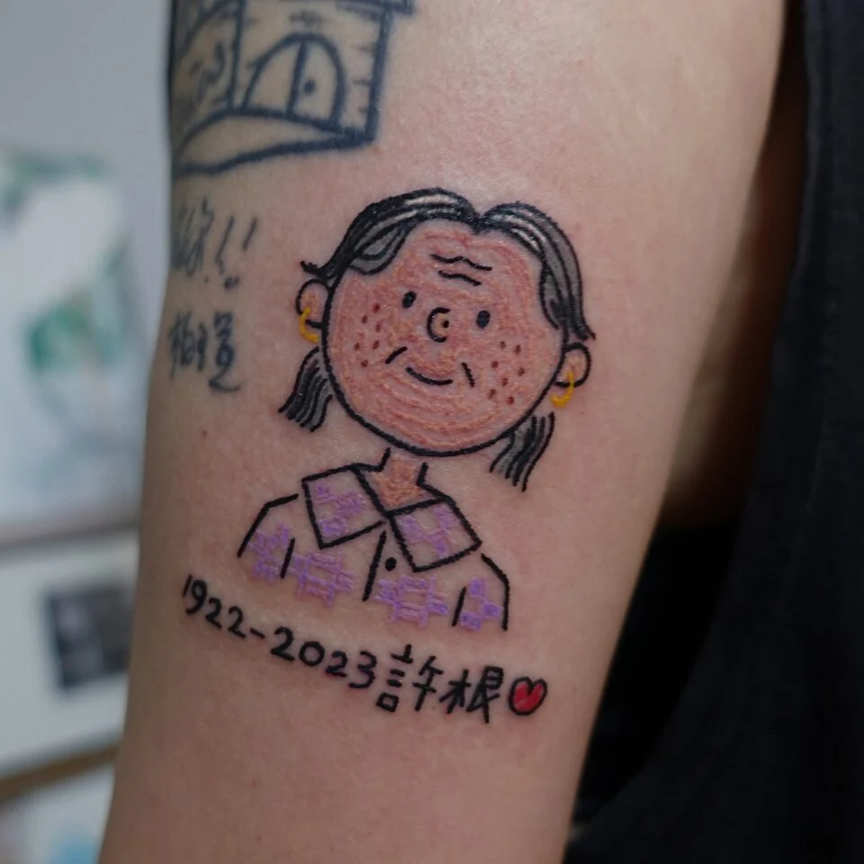 This tattoo resembles a child’s drawing of an older loved one, complete with simple outlines, soft colors, and heartwarming details like freckles and a patterned shirt. Below the figure, dates and characters honor the life of someone deeply cherished. Its cartoon-like style carries a childlike honesty, turning remembrance into something tender and approachable.