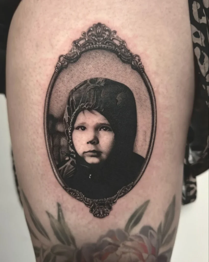This tattoo shows a highly realistic, black-and-gray portrait of a child inside an ornate oval frame. The detailed shading highlights the child’s gentle features, while the frame elevates it into a timeless keepsake, almost like a family heirloom photograph carried forever.