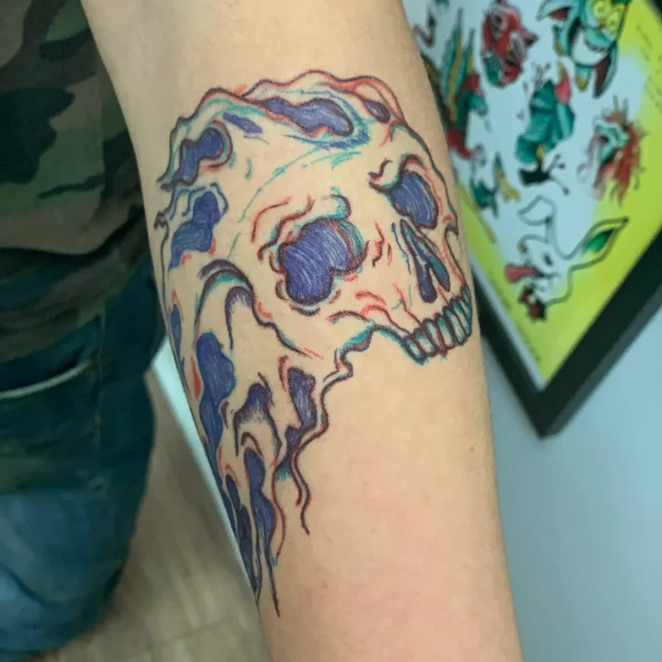 This tattoo takes the classic skull design and reimagines it through a child’s artistic lens. Its uneven lines, bold color strokes, and crayon-like shading create an unconventional yet deeply creative piece. The purple and red tones add vibrancy, while the sketchy appearance feels playful rather than intimidating.