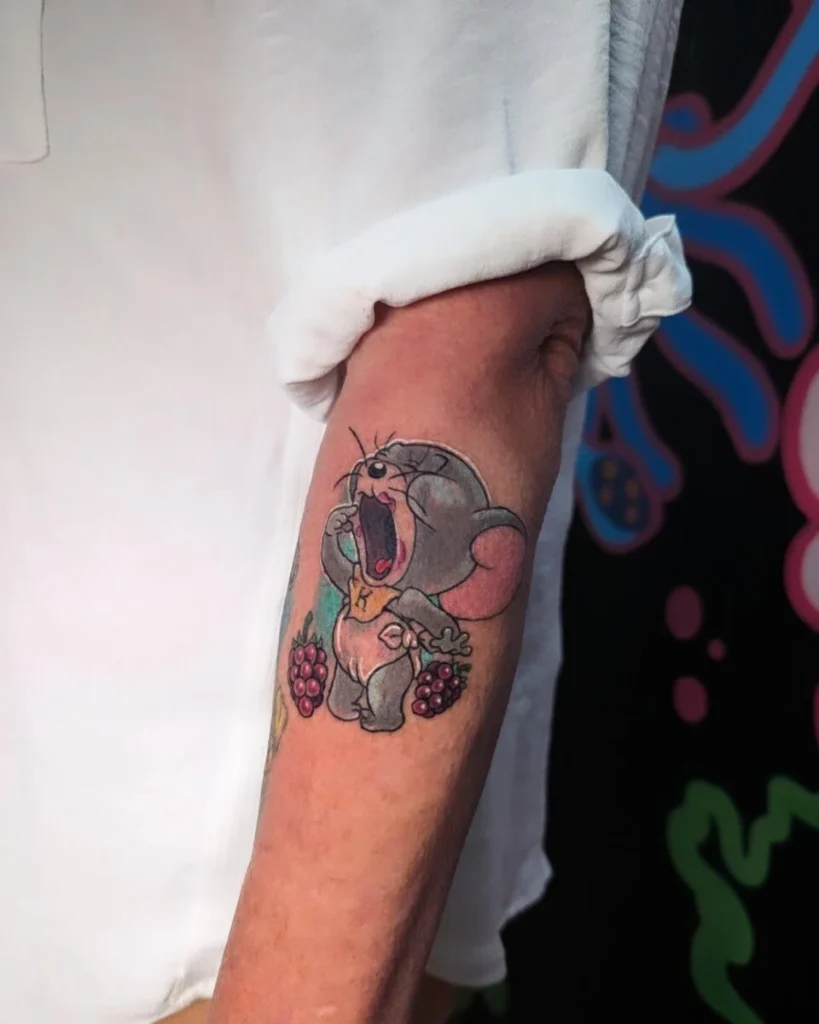 This tattoo features Jerry from Tom and Jerry, reimagined as an adorable baby mouse in diapers. With a tiny pacifier and grapes by his side, the character is captured mid-yawn, evoking the innocence and cuteness of babyhood. This playful design mixes nostalgia with parenthood, blending the joy of childhood cartoons with the wonder of having children.