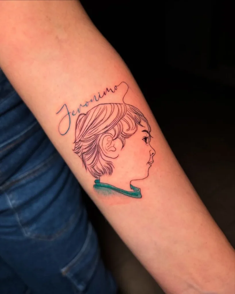 This delicate tattoo outlines the profile of a child’s face in a fine-line style, paired with the name “Jeronimo” written above in flowing script. The minimalist approach emphasizes innocence and simplicity, focusing on the child’s unique features without heavy detail.