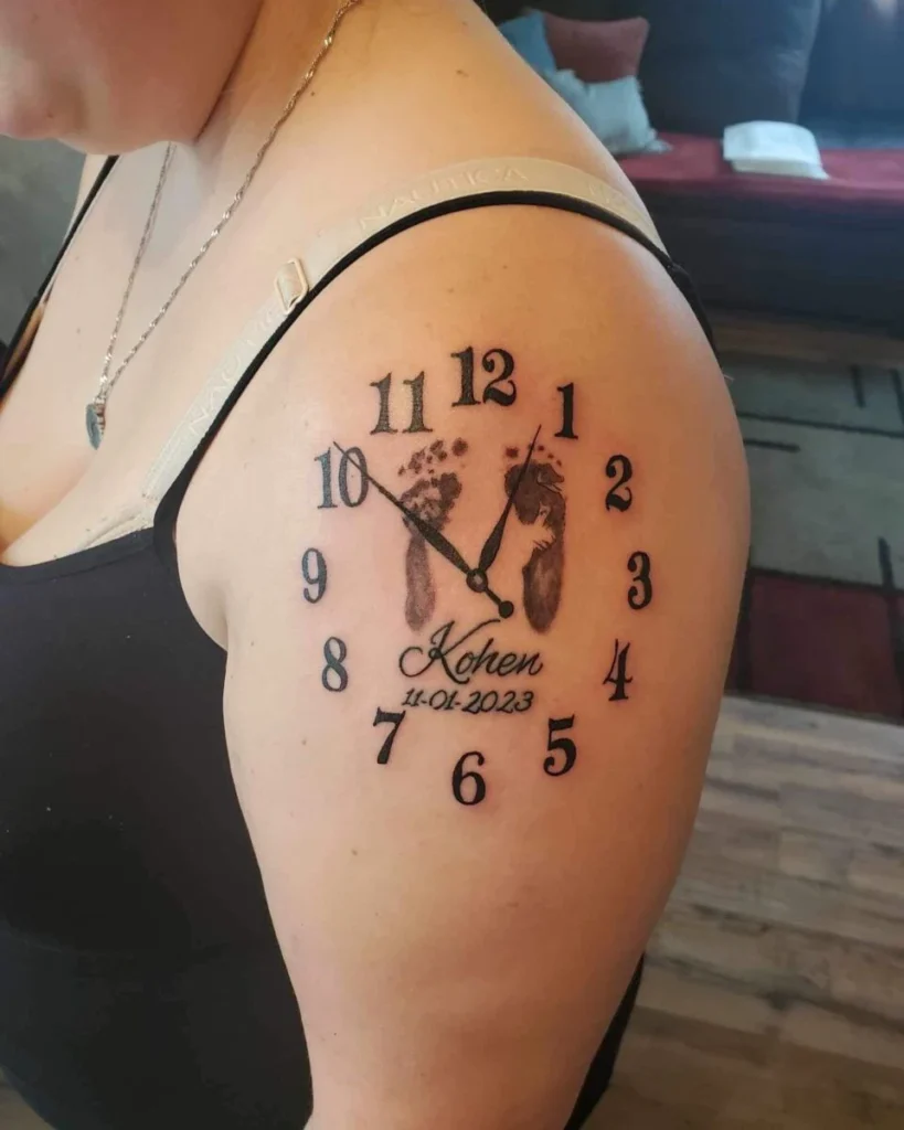 This tattoo beautifully combines the image of a clock with the footprints of a newborn child. The clock hands capture the exact time of birth, forever freezing that precious moment in ink. The name and date underneath personalize the design, transforming it into a deeply meaningful tribute.