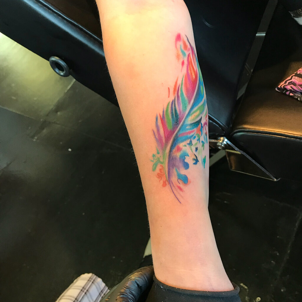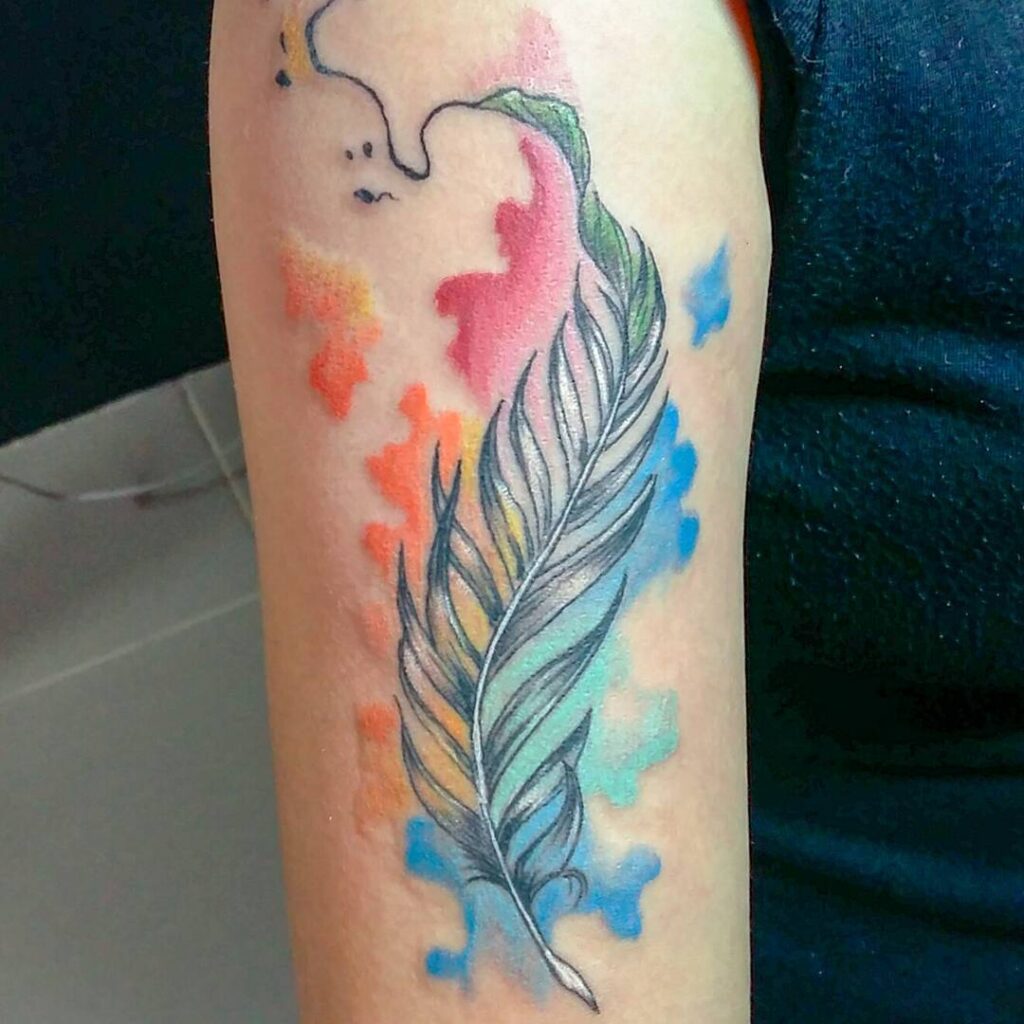 This tattoo blends vibrant shades of red, orange, blue, and green behind a fine-lined feather. The watercolor background gives the effect of paint splashes, making the design bold and artistic.
