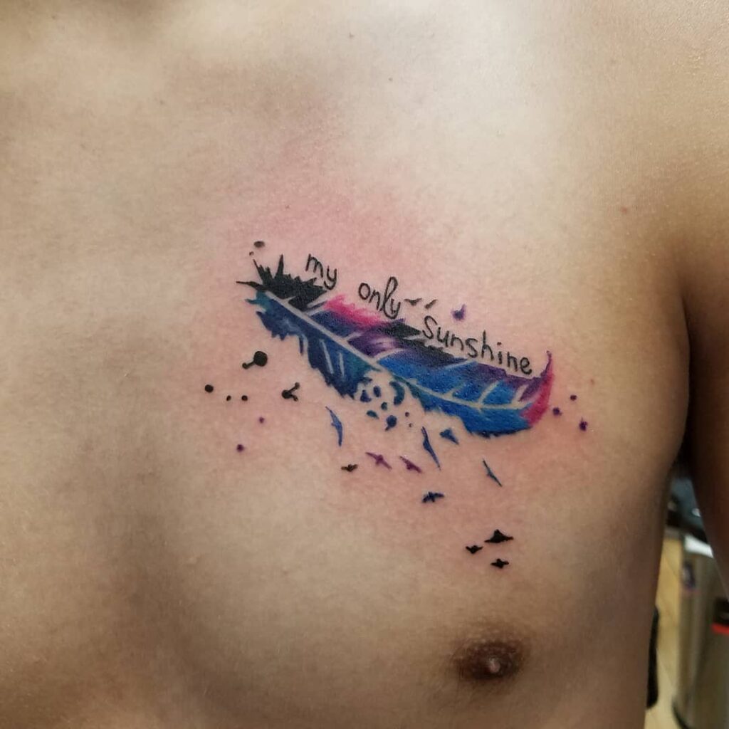 This chest tattoo combines a small feather with soft purple and blue watercolor strokes and the handwritten phrase “my only sunshine.” Tiny black birds flying away add extra emotional impact.