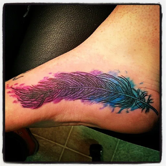 Placed beautifully on the side of the foot, this feather design uses shades of purple, pink, and blue to create a perfect ombre effect. The watercolor strokes give it a soft, brushed texture, making it feel like a painting.