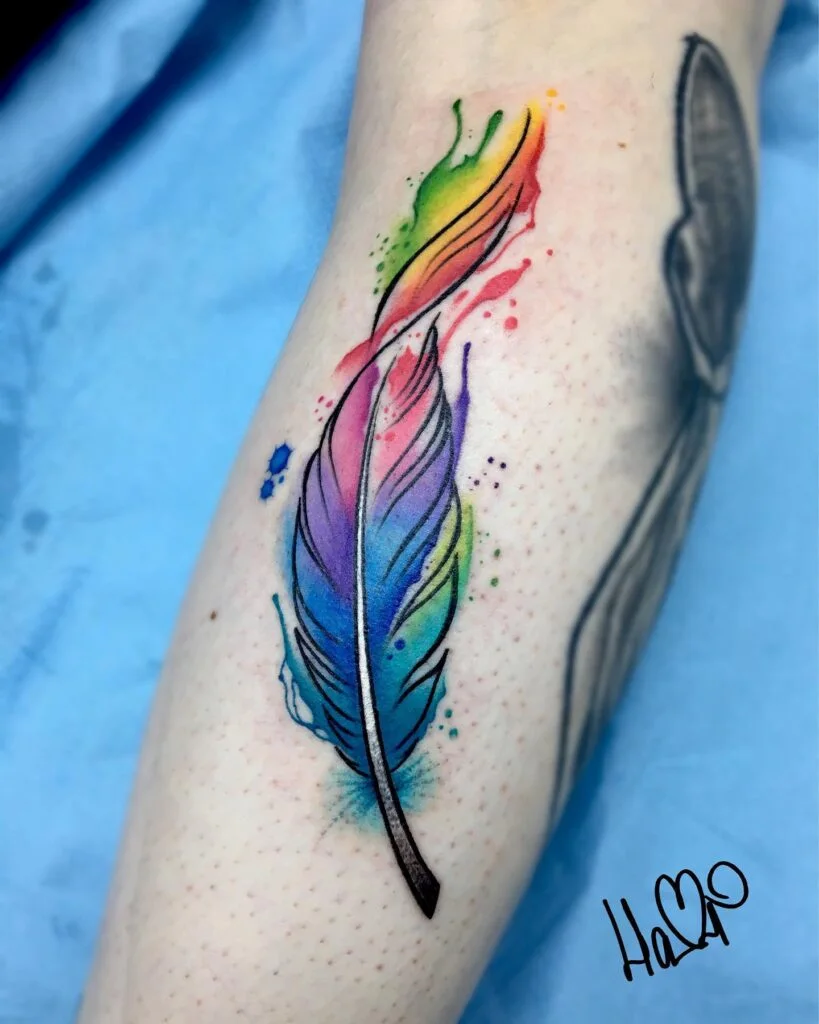 The design feels vibrant and symbolic of hope, inclusivity, and creativity. The watercolor splashes surrounding the feather amplify the sense of motion and fluidity, making it a perfect choice for those who love expressive, colorful tattoos with deeper personal meaning.