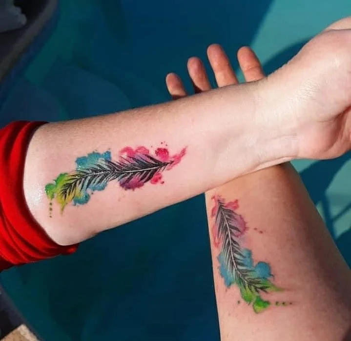 These forearm tattoos showcase twin feathers with a soft watercolor splash effect in bright hues of green, blue, pink, and yellow. The matching placement creates a strong visual connection and makes them perfect for couples, siblings, or best friends.