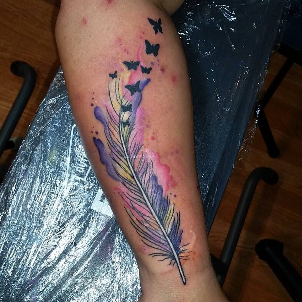 This tattoo features a long, delicate feather with pastel purple and yellow watercolor shading. Black butterflies appear to be flying out of the feather, creating a magical and lively look.