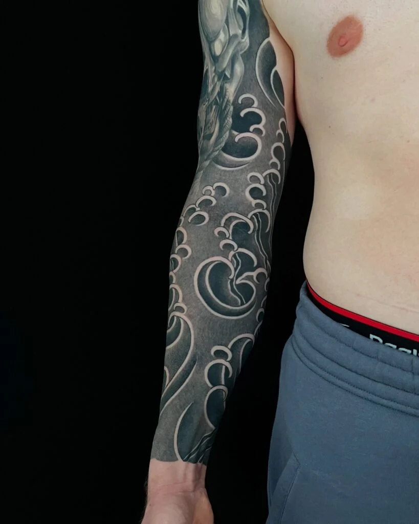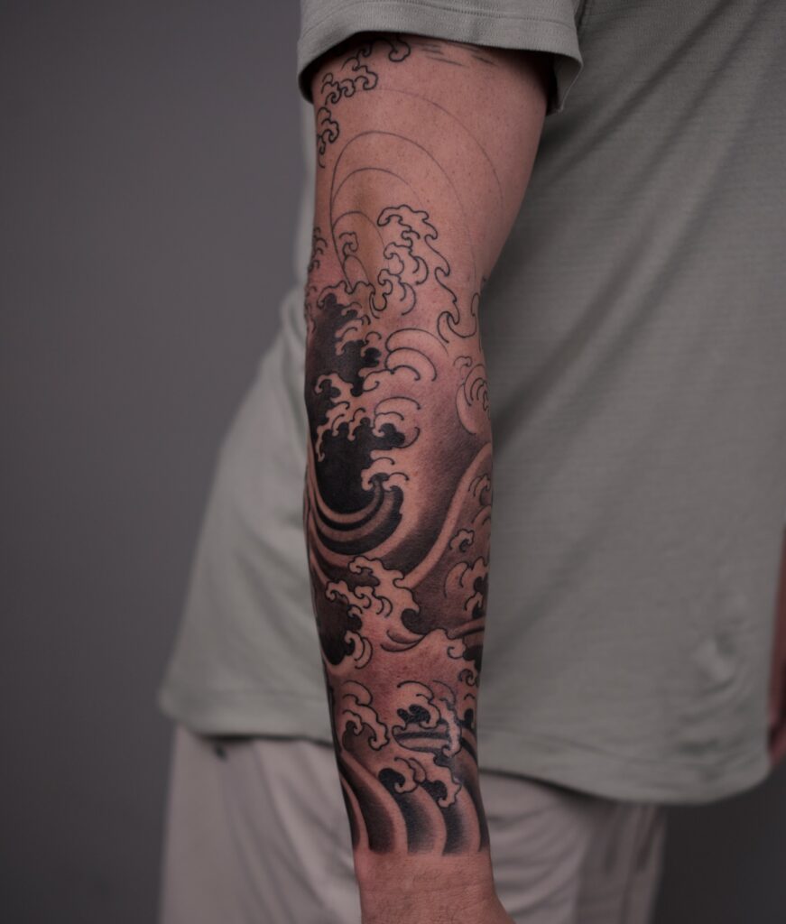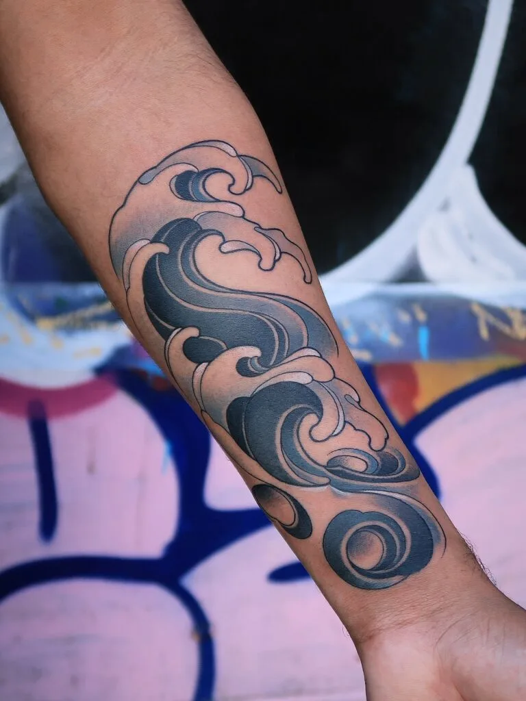 This tattoo uses bold black and grey shading to create dynamic, foamy waves flowing along the entire forearm. The detailed lines and layered tones add depth, giving the illusion of constant motion. It wraps around the arm like the ocean’s embrace.