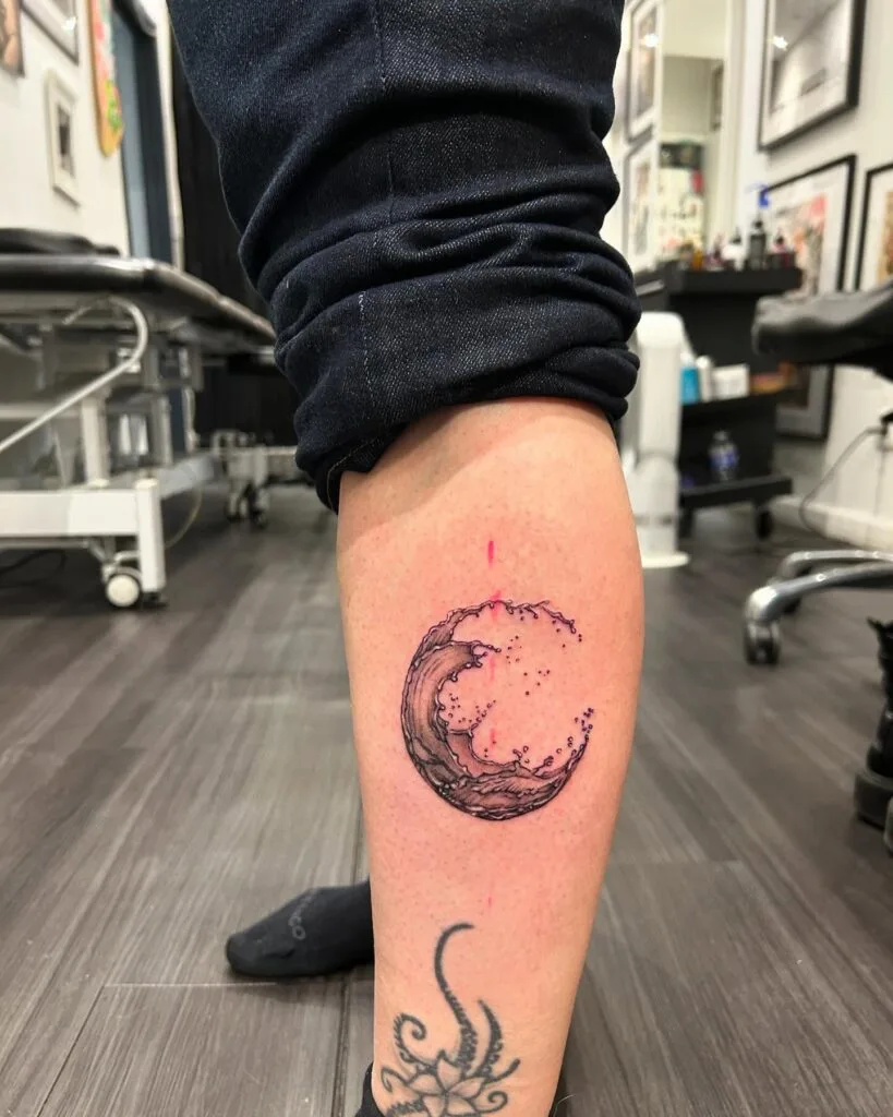 This tattoo depicts a wave curling into a perfect circle on the calf, resembling both a cresting tide and a moon shape. The circular composition creates a sense of unity and infinite flow, while the detailed linework highlights the wave’s motion.