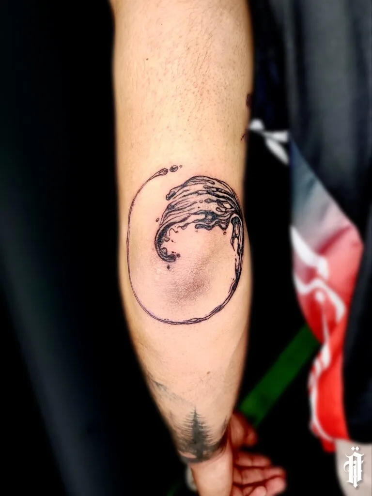 This design captures the elegance of simplicity with a wave forming a near-perfect circle. Its clean lines and minimal detail highlight the power of suggestion—showing how less can often mean more. The tattoo flows naturally around the elbow, enhancing the body’s movement.
