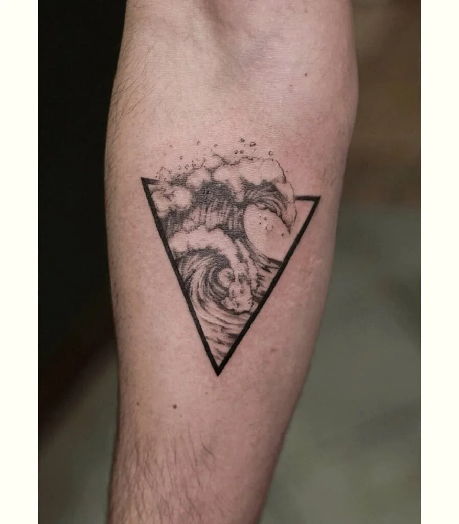 This tattoo features a crashing wave framed neatly inside a triangle, blending natural energy with geometric order. The detailed linework and stippling bring the water’s force to life, while the triangle serves as a grounding element. The contrast suggests balance between chaos and structure.