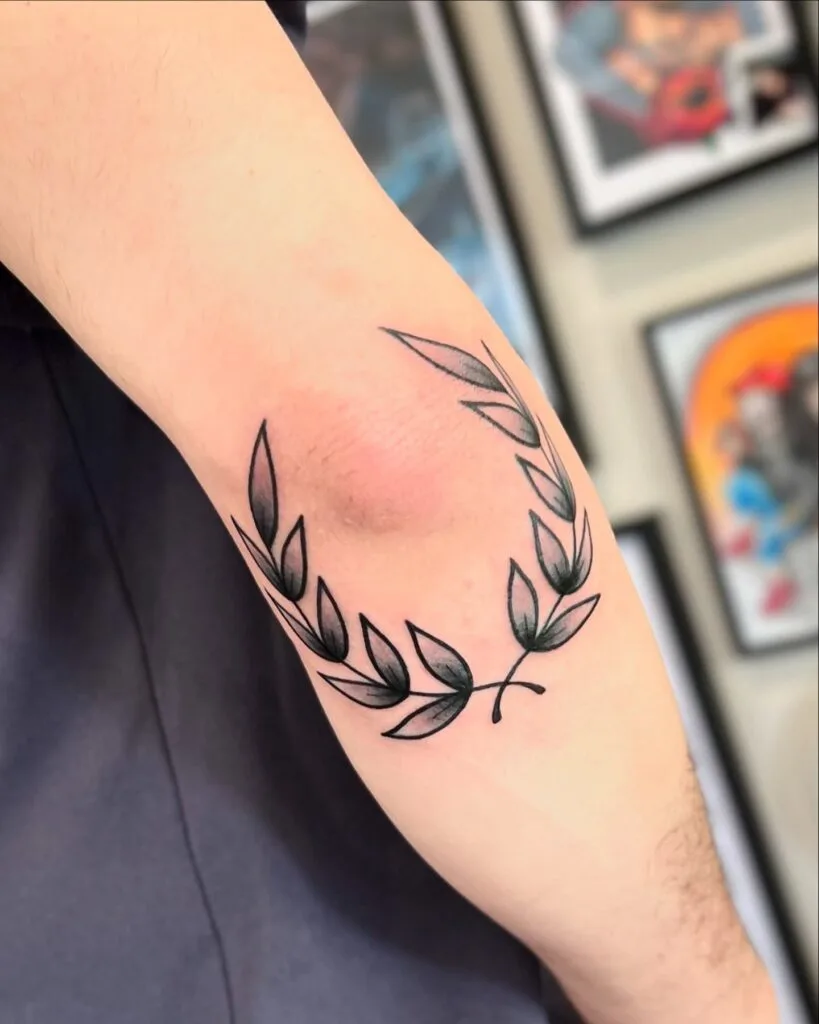 This tattoo, placed around the elbow, features a beautifully shaded laurel wreath. The leaves are given depth through subtle gradients, adding dimension and realism to the design. The wreath curves naturally, following the arm’s movement for a dynamic look.