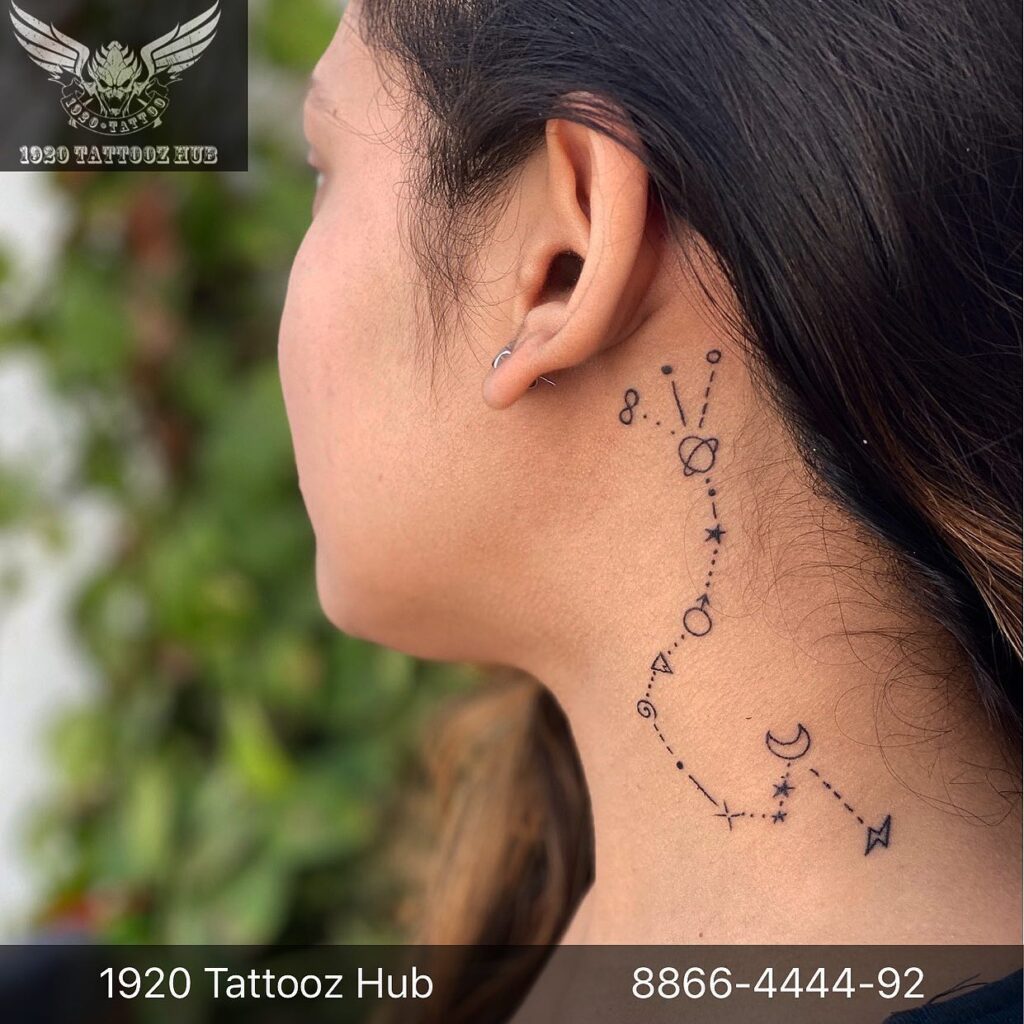 This fine-line neck tattoo traces the Leo constellation in a minimal, elegant way, featuring dots, stars, and celestial accents. Its placement makes it highly visible, radiating confidence and pride.