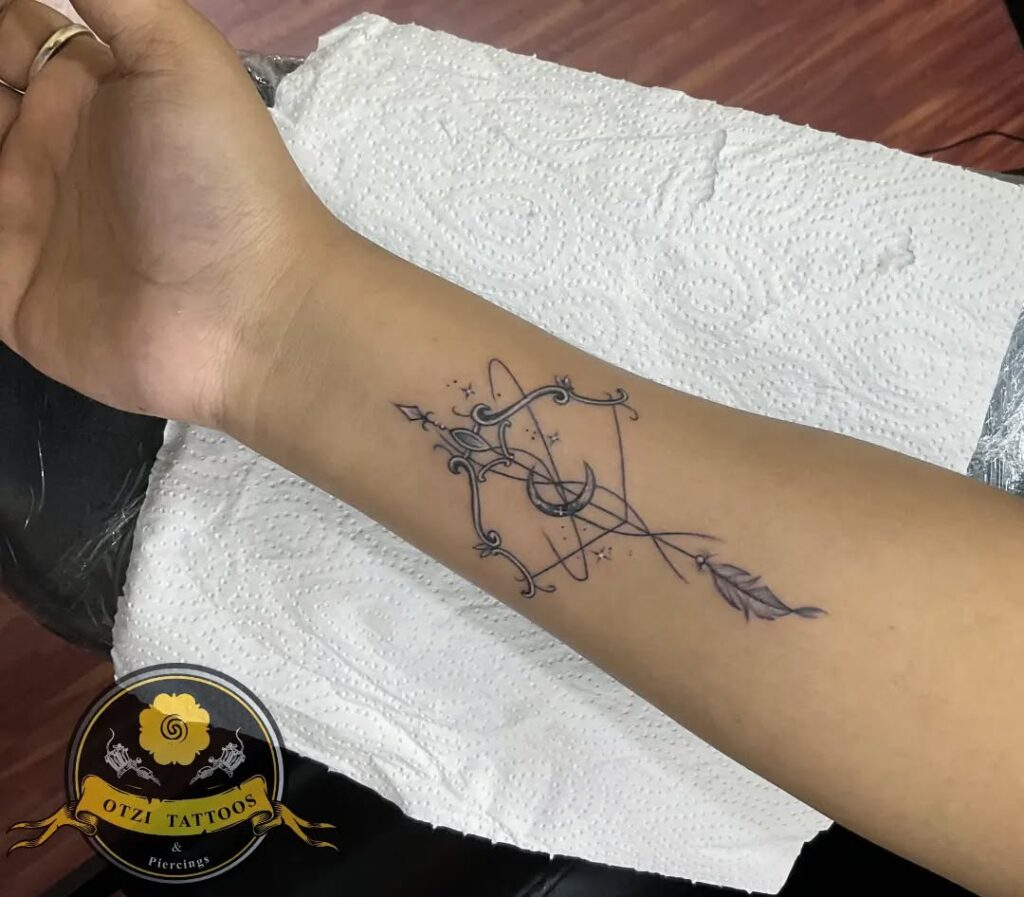 This forearm tattoo features a beautifully detailed arrow enclosed within an ornamental frame, with tiny stars and a crescent moon adding a celestial vibe. The linework is clean and delicate, emphasizing Sagittarius’ adventurous and free-spirited nature.
