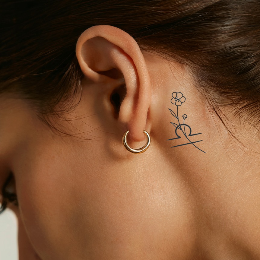 This tattoo is placed just behind the ear, combining a minimalist Libra glyph with a tiny line-drawn flower sprouting above it. The design is feminine, graceful, and perfect for subtle placement.