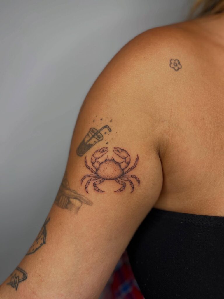 Placed on the upper arm, this tattoo features a detailed crab rendered in fine dotwork shading, capturing Cancer’s symbolic animal with elegance and realism. The soft details make it approachable yet meaningful.