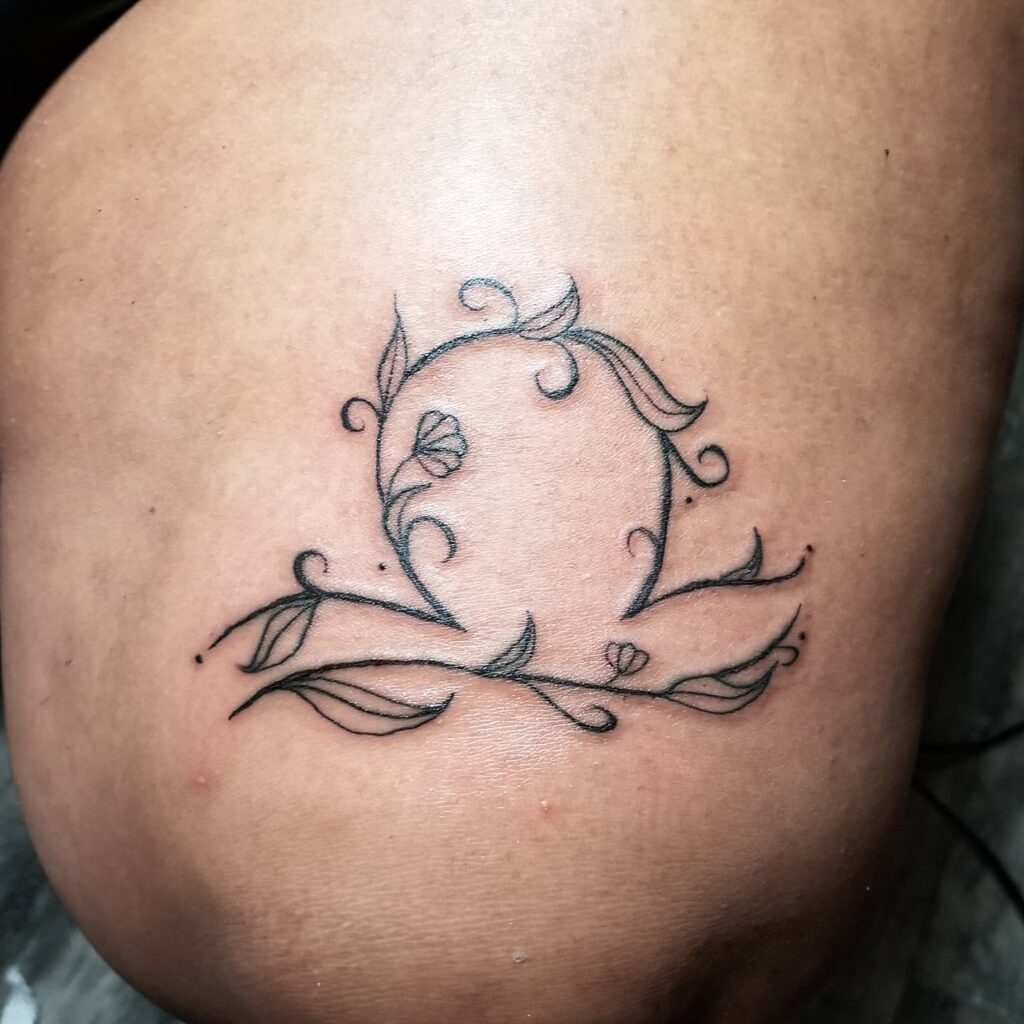 This delicate tattoo turns the Libra zodiac glyph into a flowing, nature-inspired design decorated with leaves and small flowers. The fine linework creates a graceful, almost whimsical look that celebrates Libra’s connection to harmony and beauty.