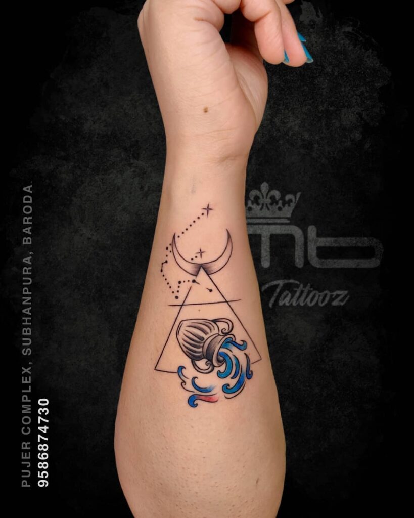 This forearm tattoo combines an Aquarius water bearer with a crescent moon and a triangle, forming a mystical geometric arrangement. The touch of blue in the waves adds a pop of color that makes the design vibrant and eye-catching.