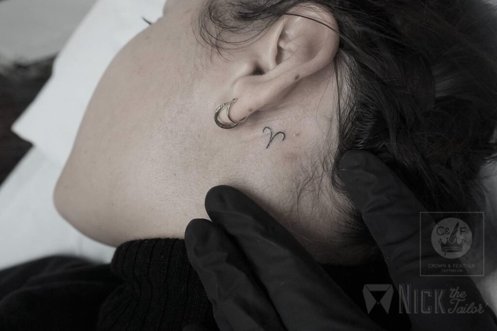 This minimalist Aries glyph tattoo sits just behind the ear, making it discreet yet powerful. Its small size allows it to be hidden or shown depending on hairstyle, adding a playful, secretive element to the design.