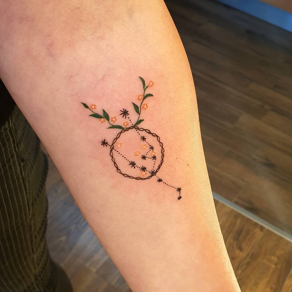 This tattoo delicately combines the Taurus constellation with a floral wreath, featuring tiny orange blossoms and green leaves. The dotted star pattern gives it a dreamy, soft touch, blending astrology with nature.
