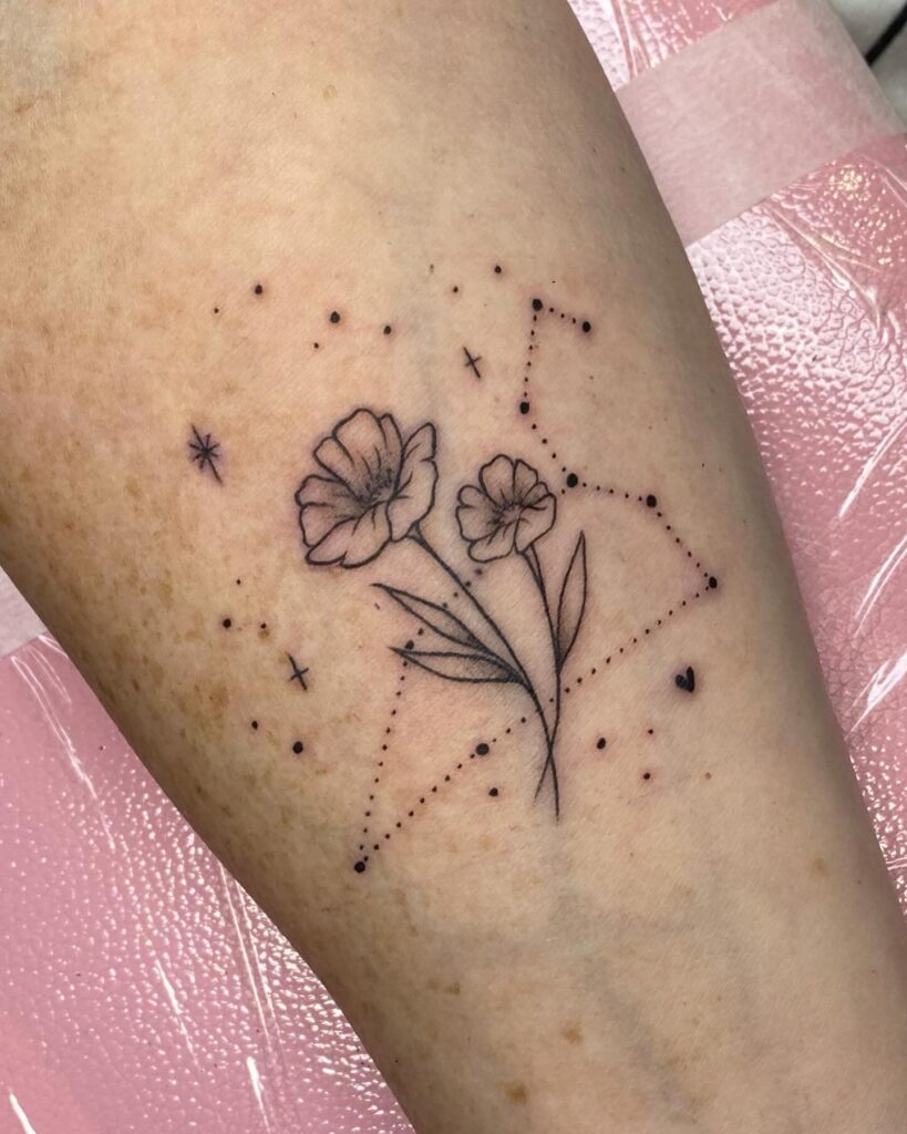 The design’s placement on the leg or arm makes it subtle yet eye-catching, perfect for those who connect deeply with Taurus’ grounded, earthy energy. The flowers symbolize growth and resilience, adding an extra layer of meaning.