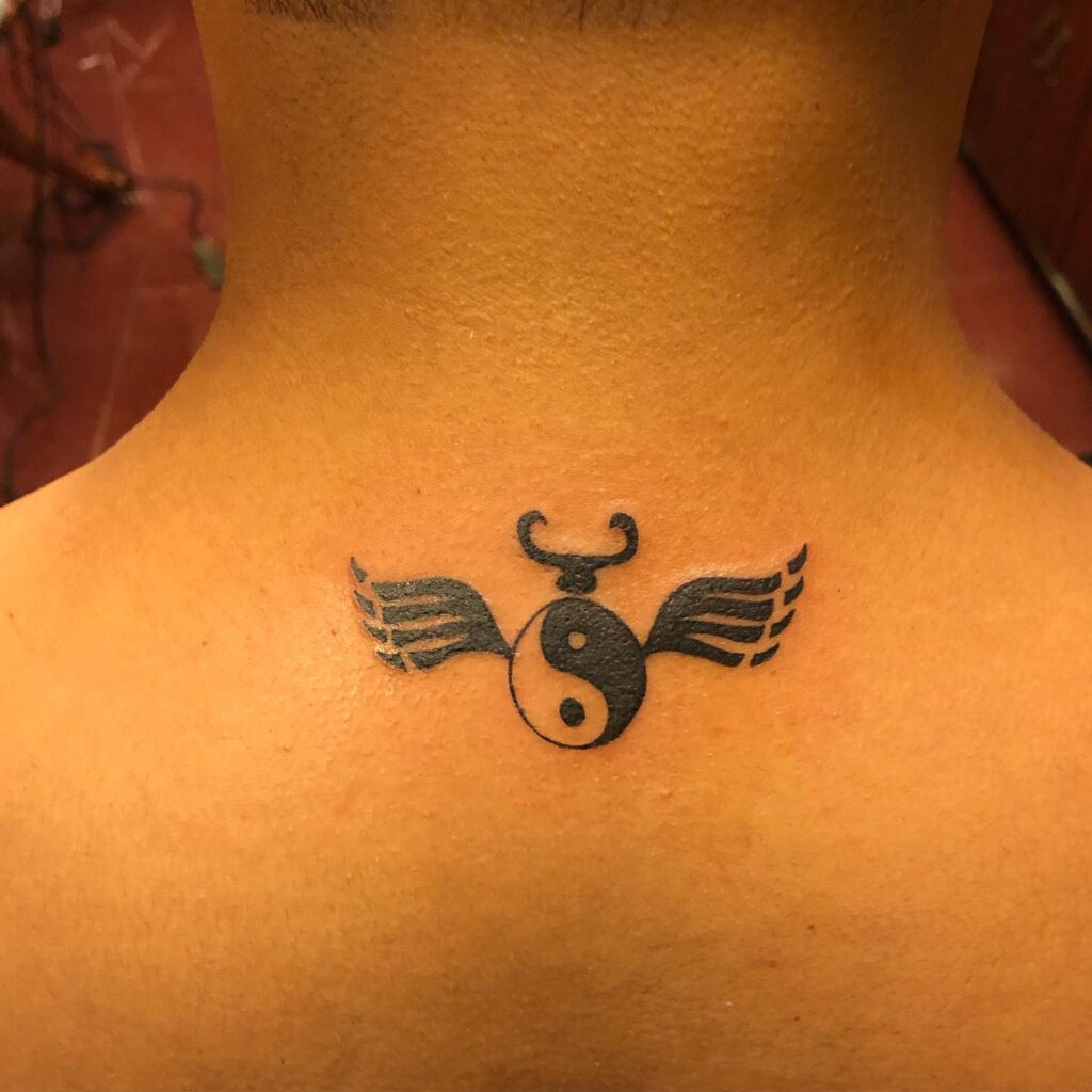Placed at the nape of the neck, this tattoo merges the yin-yang symbol with Taurus-inspired horns and wings. The design is a powerful nod to balance, duality, and grounded strength, making it a striking choice for those who resonate with both Eastern philosophy and astrology.