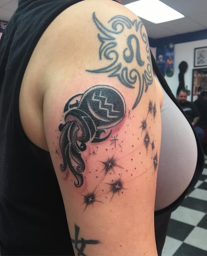 This upper arm tattoo beautifully combines the Aquarius symbol, a detailed water bearer pouring waves, and a starry constellation. The dark shading adds depth, while the stars form a celestial connection, making this design perfect for astrology enthusiasts who want to wear their sign proudly.