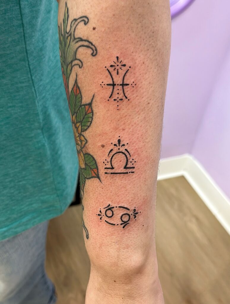 This forearm tattoo displays three zodiac symbols—Pisces, Libra, and Cancer—inked in a minimal dotwork style. The placement is clean and modern, creating a delicate yet meaningful representation of personal or loved ones’ signs.